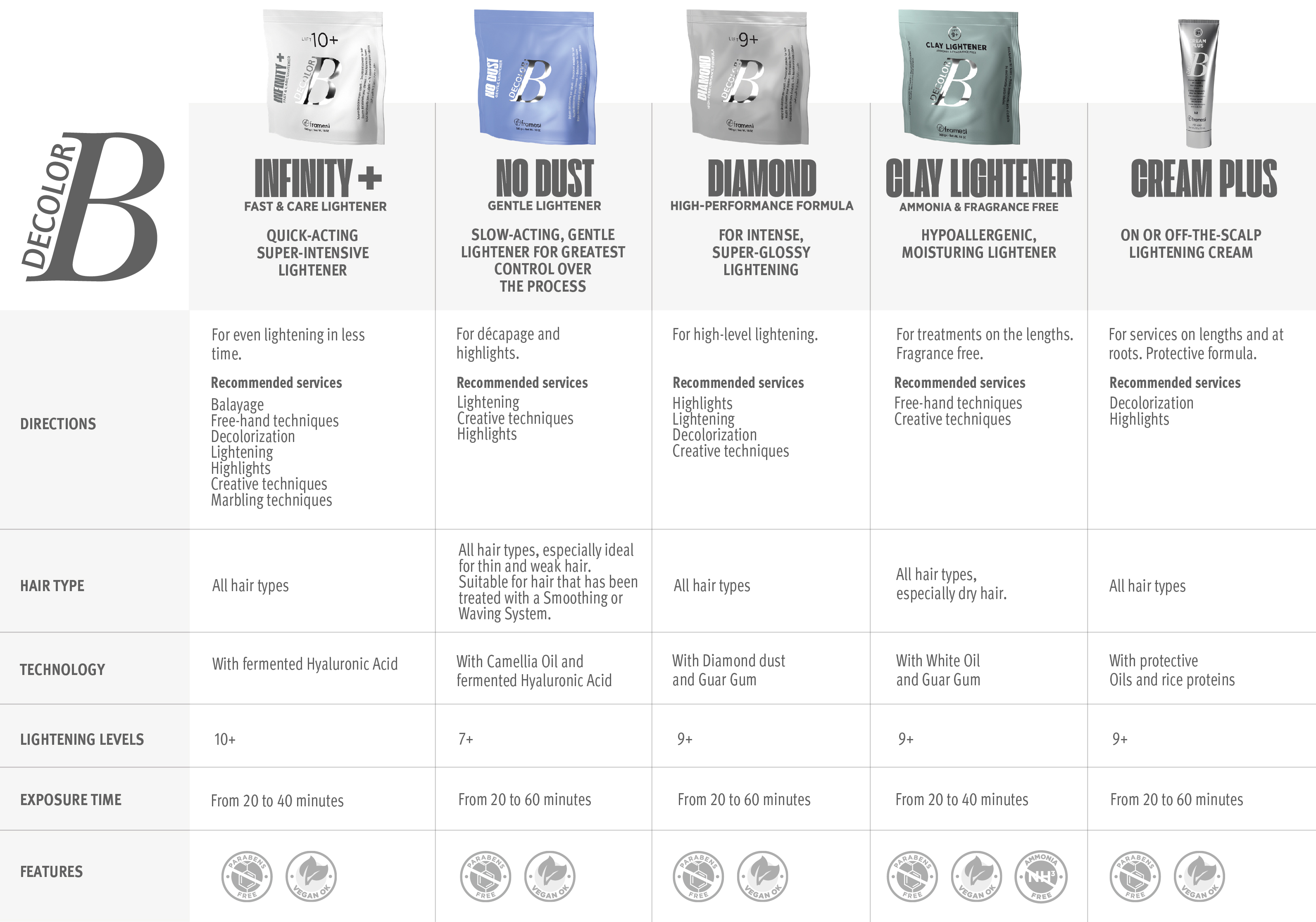 Decolor B has always been the most popular product among colorists for its delicate action, its versatility and safe and bright results.
