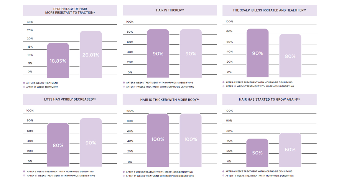 The effectiveness and self-assessment tests carried out by Eurofins of Roma, have detected top performance in the intensive MORPHOSIS DENSIFYING treatment.