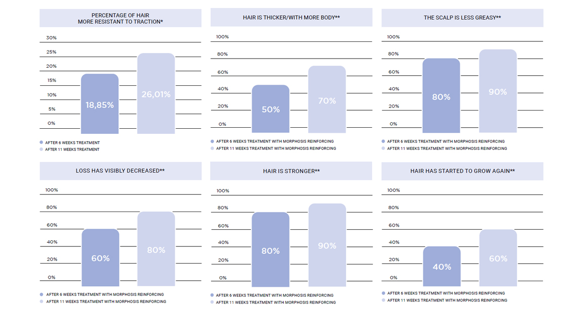 The effectiveness and self-assessment tests carried out by Eurofins of Roma, have detected top performance in the intensive MORPHOSIS REINFORCING treatment.